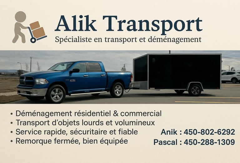Un service exceptionnel! Alik Transport a déplacé mes meubles avec soin et professionnalisme. Je recommande vivement leurs services pour tous vos petits déménagements.